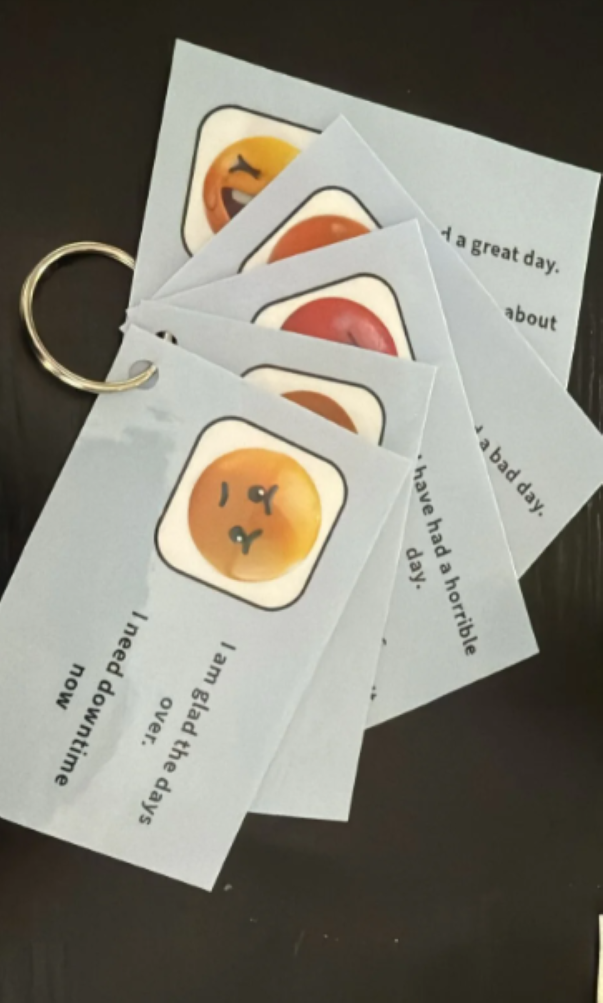 This handy keyring set is designed to help express and understand emotions with ease. Each card features a simple visual cue and short message, making it a great tool for children, adults, or anyone who finds it helpful to communicate how they feel in a clear and nonverbal way.